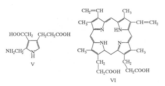 аминолевулиновой к-ты с образованием порфобилиногена (ф-ла V), к-рый в результате ряда ферментативных превращений дает протопорфирин (VI). Из последнего образуется непосредственный предшественник хлорофилла- хлорофиллид, содержащий атом Mg. Путем последующих р-ций восстановления и присоединения остатков спиртов из него образуется хлорофилл. Стадия восстановления хлорофиллида осуществляется у высших растений на свету, у низших - в темноте.