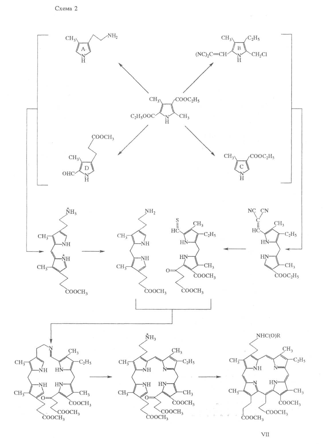 Синтез хлорофилла а - одно из замечательных достижений в области орг. химии. Полный синтез включает 46 стадий. Его осн. этапы представлены схемами 2, 3. Первый этап заключается в последоват. синтезе порфирина VII из четырех пирролов -предшественников колец A-D молекулы хлорофилла через два дипир-ролилметана (схема 2). Второй этап - превращение порфирина VII в триметиловый эфир хлорина е6 (VIII) с транс-конфигурацией при атомах С-17 и С-18 (т. наз. пурпуриновая р-ция; схема 3), послед. циклизация к-рого приводит к хлорофиллу а. Полный синтез хлорофилла а осуществил Р. Вудворд в 1960.