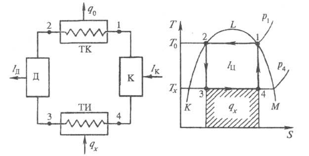 В случае протекания всех процессов в области влажного пара при равновесии жидкость - пар (рис. 4; здесь и далее под кривой KLM)изотермы T0, Тхи изобары p1, p4 совпадают. Схема холодильной установки упрощается: она включает только компрессор и детандер для изоэнтропийного сжатия (процесс 4-1) и расширения (процесс 2-3), а также теплообменник (конденсатор) ТК и теплообменник (испаритель) ТИ, обеспечивающие обратимые процессы передачи теплоты.