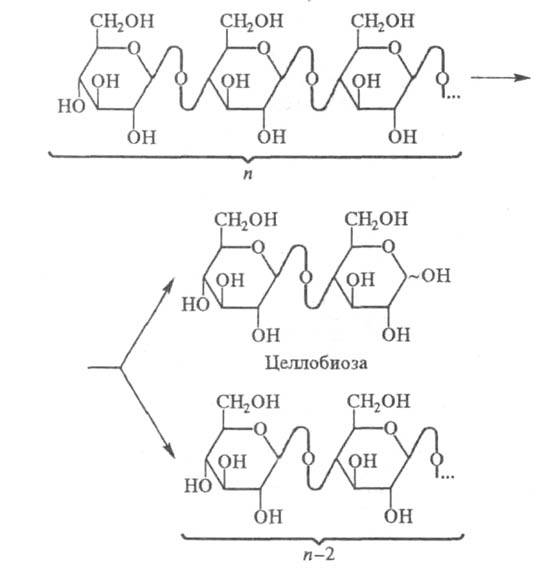 Целлюлазы второго типа гидролизуют молекулы целлюлозы, образуя почти исключительно целлобиозу, к-рую они отщепляют с невосстанавливающего конца полисахарида (п - число звеньев цепи):