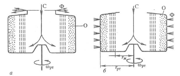 Рис. 1. Роторы машин для центробежного осаждения (а) и фильтрования (б): С - суспензия, Ф - фугат (фильтрат), О - осадок; пояснение в тексте, rж -радиус свободной поверхности жидкости.