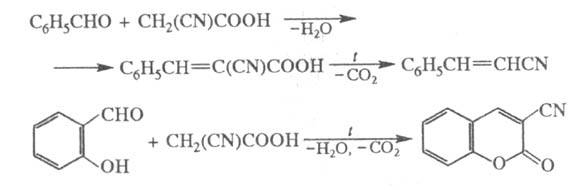 Циануровая кислота и ее производные вступают в р-цию с карбонильными соед. в условиях Кнёвенагеля реакции, напр.: