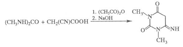 Р-ция циануровой кислоты и ее эфиров с мочевиной и ее производными приводит к азотсодержащим гетероциклам, напр, с 1,3-диметилмочевиной образуется 1,3-диметил-4-иминоурацил - полупродукт в синтезе пуриновых алкалоидов (теофиллина, кофеина):