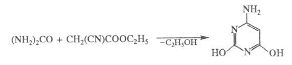Р-цией этилового эфира циануровой кислоты с мочевиной получают 2,4-дигидрокси-6-аминопиримидин: