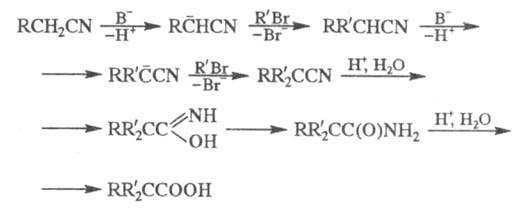 Обычно к свежеприготовленному р-ру основания добавляют р-р нитрила и затем избыточное кол-во R'Br (иногда реагенты вводят в р-цию поочередно частями). Образовавшийся нитрил RR'2CCN обрабатывают при т-ре ок. 100 °С конц. H2SO4, амид - смесью NaNO2 и H2SO4 или смесью C4H9ONO/CH3COOH/HC1. Выходы 30-90%.