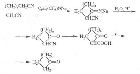 Наиб. легко и с высоким выходом в Циглера реакции образуются циклы C5-C7, выходы циклич. кетонов С9-С13 весьма низкие (1-13%), для получения циклов С14-С33 используют спец. аппаратуру и большое разбавление (выход 60-80%). Циклы С3-С4 этим способом получить не удается.
