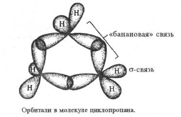Циклопропан - простейший циклоалкан, трехчленный цикл к-рого обладает значит. энергией напряжения (~ 115 кДж/моль) и повышенной по сравнению с др. циклоалканами хим. активностью. Углы в циклопропане 60° (ССС), 114-115° (НСН), длины связей 0,151 (С —С) и 0,109 нм (С —Н). Малая величина угла ССС по сравнению с углом между sр3-гибридизованными орбиталями (109,5°) позволяет предположить, что при образовании связей С — С в циклопропане не достигается макс. перекрывание атомных орбиталей. Такие связи наз. "банановыми" (рис.), по своему характеру они являются промежуточными между