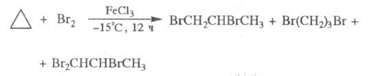 С хлором и бромом циклопропан реагирует неодинаково. В условиях радикального бромирования образуется 1,3-дибромпропан, а радикального хлорирования в мягких условиях - 1,1-дихлорциклопропан. При электроф. бромировании получают смесь бромпропанов: