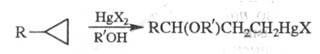 Р-ция циклопропана и его производных с солями ртути в среде протонных р-рителей приводит к