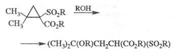Замещенные циклопропана, содержащие электронодонорные и электроноакцепторные группы, при умеренном нагревании претерпевают гетеролиз по наиб. замещенной связи, напр.: