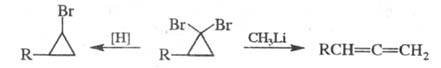 1,1-Дигалогенциклопропаны при действии (C4H9)3SnH или Mg в СН3ОН восстанавливаются в моногалогениды, а при взаимод. с CH3Li превращаются в соответствующие аллены: