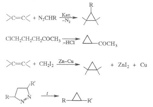 галогензамещенных кетонов, эфиров или нитрилов; взаимод. олефинов с СН2I2 в присут. пары Zn - Сu (см. Симмонса-Смита реакция); термич. разложение пиразолинов: