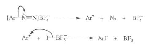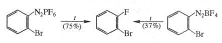 Для получения арилфторидов применяют также гексафторфосфаты, гексафторантимонаты и гексафторсиликаты арилдиазония; при этом выход конечного продукта повышается из-за стабильности и легкости выделения этих солей, напр.: