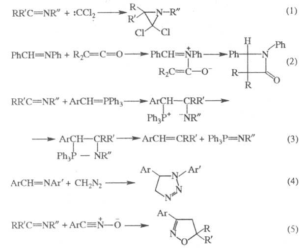 Для шиффовых оснований характерны р-ции циклоприсоединения с соед., содержащими кратные связи. Так, с карбенами образуются азиридины (р-ция 1), с кетенами -