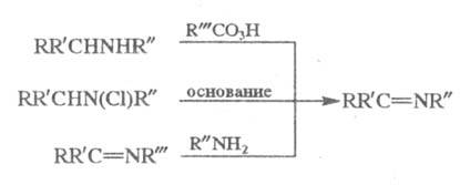 Шиффовы основания могут быть получены также окислением вторичных аминов, р-циями элиминирования из разл. субстратов, напр. N-хлораминов, р-цией переаминирования, напр.: