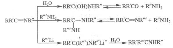Р-ции с нуклеофилами протекают по атому углерода. В присут. разбавленных к-т шиффовы основания гидролизуются до аминов и кетонов; в щелочной среде большинство устойчиво; присоединяют амины (продукты присоединения склонны к пере-аминированию); с реактивами Гриньяра и литийорг. соед. реагируют аналогично карбонильным соед.; при взаимод. с HCN и триметилсилилцианидом в условиях Штреккера реакции образуются