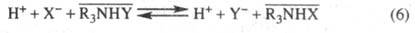 Анионный обмен характерен для экстракции минер. к-т и ионов металлов солями аминов и четвертичных аммониевых оснований, напр.: