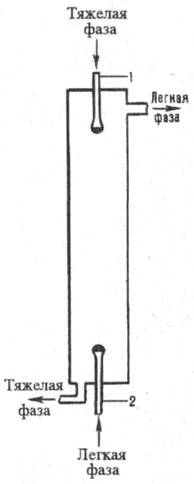 Аппаратурное оформление процесса. По способу контакта фаз пром. экстракторы подразделяют на дифференциально-контактные (колонные аппараты), ступенчатые и промежуточные конструкции. Аппараты первой группы отличаются непрерывным контактом фаз и плавным изменением концентрации извлекаемого компонента вдоль длины (высоты) аппарата. При таком профиле концентраций фазы ни в одной точке экстрактора не приходят в равновесие. Эти аппараты более компактны и требуют ограниченных производств. площадей, однако в них за счет продольного перемешивания (обусловлено конвективными осевыми потоками, застойными зонами, турбулентными пульсациями и т. д.) может значительно уменьшаться средняя движущая сила.