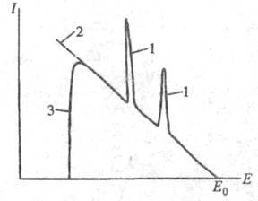 Рис. 2. Рентгеновский спектр в РСМА: 1 - линии характеристич. рентгеновского излучения; 2 -непрерывное рентгеновское излучение без поглощения (фон); 3 -область самопоглощения непрерывного рентгеновского излучения.