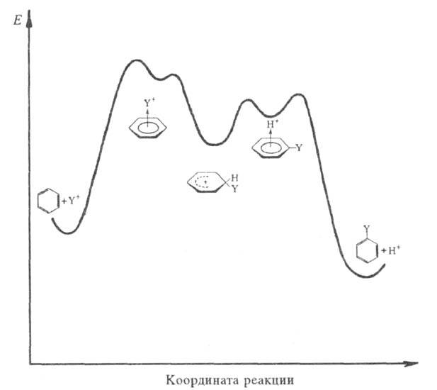 Схематич. изображение изменения энергии системы в р-циях электроф. замещения в ароматич. ядре.
