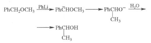 CH3Hg*X + HgX2 возрастает в 8 раз при переходе от Х = Вг к Х = 1 и в 240 000 раз при переходе от X = ОСОСН3 к X = NО2. В нек-рых случаях электроф. замещение может сопровождаться перегруппировками углеродного скелета молекулы. Напр., бензиновые эфиры при действии литийорг. агентов изомеризуются в спирты (перегруппировка Виттига):