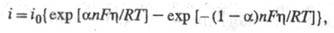 ; i0 - плотн. тока обмена, к-рая обусловлена константой скорости стадии разряда - ионизации, строением двойного электрич. слоя, зарядовыми числами частиц Ох и Red и их энергиями адсорбции на данном электроде. При учете стадии массопереноса ур-ние принимает вид: