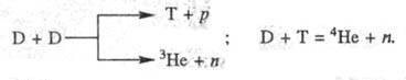 Выделяющиеся нейтроны поглощаются ядрами 6Li, при этом образуется дополнит. кол-во трития по р-ции 6Li + п = Т + 4Не. Тритий вступает в р-цию с дейтерием, вновь возникают нейтроны, способные взаимод. с 6Li, и т. д. Теплотворная способность термоядерного горючего в 5-6 раз выше, чем у делящихся материалов. Запасы дейтерия в гидросфере составляют порядка 1013 т, а его энергетич. ресурсы - св. 1025 МДж. В наст. время практически осуществляются только неуправляемые р-ции (взрыв), широко ведется поиск методов осуществления управляемой термоядерной р-ции, позволяющей в принципе обеспечить человечество энергией практически на неограниченный срок. C. А. Кабакчи.