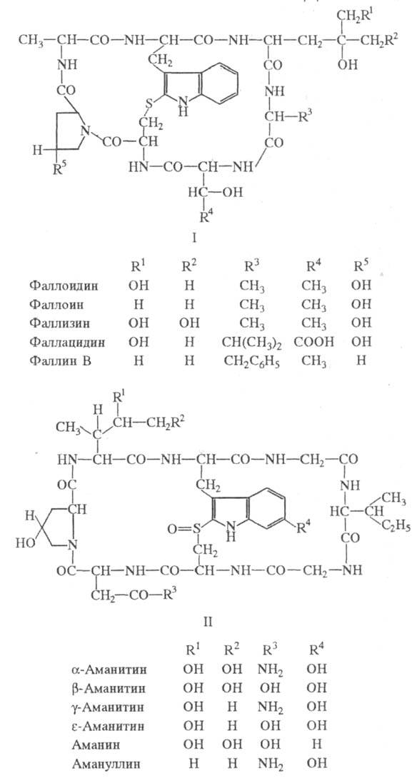 Яды грибов из рода мухомор (Amanita) - фаллотоксины и аматоксины (соотв. ф-лы I, II) - содержатся в разл. видах: бледной поганке (A. phalloides), мухоморе вонючем (A. virosa), весеннем (A. verna) и др. Молекулы этих соед. представляют собой бициклич. полипептиды, в к-рых мостик содержит фрагмент молекулы триптофана или его производных. Механизм токсич. действия аматоксинов у человека и животных связан с ингибированием ДНК-зависимой РНК-полимеразы (см. РНК-полимеразы);фаллотоксины необратимо связываются с примембранным актином, вызывая его полимеризацию, что приводит к нарушению мембран гепатоцитов (клеток печени). Для мышей ЛД50 (в мг/кг) при пероральном введении (через рот) наиб. активных токсинов: 1 - a-аманитин, 3 -6049-8.jpg-аманитин, 7 -6049-9.jpgаманитин, 10 - фаллоин, 28 -фаллоидин. Для человека смертельная доза a-аманитина 5-7 мг, фаллоидина 20-30 мг (в одном грибе в среднем содержится до 10 мг фаллоидина, 8 мг6049-11.jpg-аманитина и 5 мг6049-12.jpg -аманитина). Скрытый период действия 6 - 48 ч. Первичные симптомы отравления: рвота, кишечные колики, боли в мышцах, жажда, холероподобный понос; возможно проявление желтухи и увеличение печени. Происходят снижение артериального давления, потеря сознания. Смерть наступает в результате токсич. гепатита и острой сердечной недостаточности. Первая помощь: промывание желудка, прием активир. угля, искусств. дыхание.