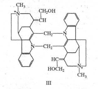 Группа кураринов включает неск. десятков токсичных алкалоидов, обладающих паралитич. активностью (продуценты - виды рода стрихнос S. toxifera и S. lasteniae). Наиб. сильный яд этой группы - С-токсиферин I (ф-ла III), проявляющий парализующее действие для теплокровных в дозах 10 мкг/кг (в опытах на нервных клетках). Летальная доза для человека при внутривенном (в/в) введении ок. 20 мг.