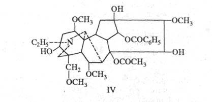 Аконитин (IV) и близкий ему по св-вам зонгорин (ф-лу см. в ст. Дитерпеновые алкалоиды), содержащиеся в разл. видах аконита (Aconitum soongaricum и др.), обладают судорожно-паралитич. действием, к-рое обусловлено повышением проницаемости Na+ в мембранах нервных и мышечных клеток и их деполяризации. Симптомы тяжелого отравления: учащение и затем замедление дыхания, озноб, потовыделение, боль в области сердца и аритмия, паралич скелетных мышц, понижение т-ры тела. Смерть наступает в результате остановки сердца и паралича дыхания. ЛД50 0,035 мг/кг (собаки, в/в), летальная доза для человека при пероральном введении - 2-5 мг. Первая помощь: промывание желудка р-ром таннина, прием активир. угля, теплое питье.