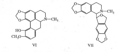 Растения семейства дымянковых Fumariaceae (хохлатка полая, хохлатка Горчакова, хохлатка Маршалла) содержат ядовитые алкалоиды группы бульбокапнина - бульбокапнин, бикукулин (соотв. ф-лы VI, VII) и др. Бульбокапнин оказывает влияние гл. обр. на центр. нервную систему. В небольших дозах он вызывает каталепсию (вид двигат. расстройства), снижение артериального давления; в больших (0,3-0,5 мг/кг, мыши) - судороги, заканчивающиеся смертью. Бикукулин - судорожный яд, блокирующий тормозные рецепторы6049-17.jpgаминомасляной к-ты в нервной системе. При действии экстрактов, содержащих сумму алкалоидов дымянковых, наблюдаются угнетение центр. нервной системы, восковая гибкость мускулатуры, замедление сердцебиения и дыхания (вплоть до полной остановки). Первая помощь при отравлениях: промывание желудка, прием активир. угля, искусств. дыхание.