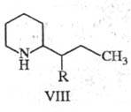 Алкалоиды группы кониина [кониин (VIII; R = Н) конгидрин (VIII; R = OH) и др.], содержащиеся в болиголове пятнистом (Conium maculatum L.), являются частыми причинами отравления домашнего скота и людей. При пероральном введении в дозах 50-150 мг они вызывают у человека восходящий паралич, тахикардию, остановку дыхания.