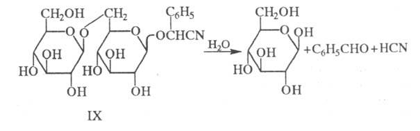 Третья группа ядов растений небелковой природы включает соед. разл. структурных типов. Простейшее ядовитое соед. HCN присутствует в растениях в связанной форме в виде цианогенных гликозидов (напр., амигдалин; ф-ла IX), к-рые высвобождают HCN в процессе ферментативного гидролиза после повреждения клетки: