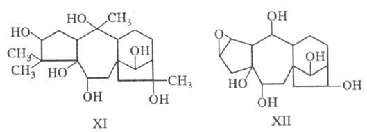 Группа токсичных дитерпенов (грайанотоксинов) содержат растения семейства рододендронов. Наиб. известные яды - грайанотоксин III (ф-ла XI) и родоспонин III (ф-ла ХП) - нейротоксины, вызывающие повышение проницаемости мембран нервно-мышечной ткани для ионов Na+. Признаки отравления: слюнотечение, нарушение координации движений, судороги (ЛД50 0,4-0,6 мг/кг, мыши, в/бр).