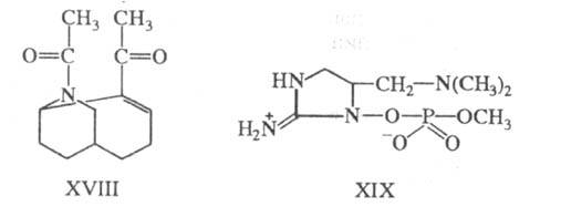 Из синезеленых водорослей выделены анабенатоксин (XVIII; быстродействующий смертельный фактор, или БДСФ) и анатоксин a(S) (XIX). Первый вызывает длит. постсинаптич. поляризацию синаптич. мембран и нейромышечную блокаду; смерть наступает от остановки дыхания (ЛД50 ок. 0,1 мг/кг, мыши, в/бр), инкубационный период ок. 15 мин. Анатоксин a(S) обладает антихолинэ стеразным действием и высокой токсичностью (ЛД50 ок. 0,02 мг/кг, мыши, в/бр).
