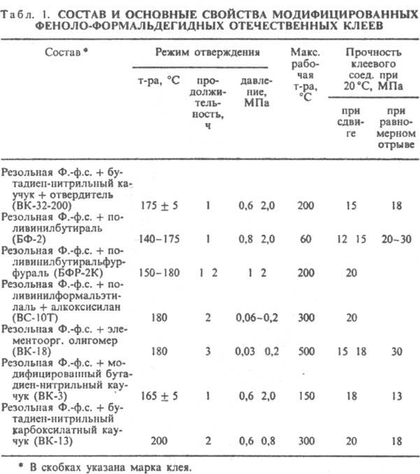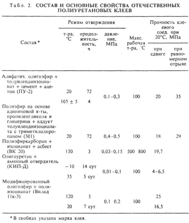 Ниже комнатной т-ры отверждаются комплексами BF3 с гликолями, алифатич. аминами или эфирами, смесью аминов с трифенилфосфитом (сохранность неск. мин), при комнатной т-ре - алифатич. аминами за 4-12 ч до степени, при к-рой изделие можно подвергать дальнейшей обработке; отверждение ускоряют введением фенолов, спиртов, третичных аминов (сохранность 1-2 ч). Макс. прочность при сдвиге (15-20 МПа) клеевых соед. достигается через неск. сут; работоспособны при т-рах не выше 80 °С. Ароматич. аминами, ангидридами многоосновных карбоновых к-т, дициандиамидом, феноло-формальд. смолой эпоксидные клеи отверждаются при 120-200 °С в течение 10-2 ч (сохранность клея не менее 24 ч). Прочность клеевых соед. до 35 МПа, они работоспособны от -50 до 200 250 °С, устойчивы к действию влаги и в тропич. климате. Эластифицир. клеи создают клеевые прослойки, отличающиеся высокой трещиностойкостью. Эпоксидные клеи универсальны; их применяют практически во всех областях народного хозяйства. Полиуретановые клеи получают на основе изоцианатов (в т. ч. и блокированных) и гидроксилсодсржащих соед. (гл. обр. олигоэфиров), реагирующих с образованием полиуретанов. Могут содержать инициаторы отверждения (вода, спирты, водные р-ры солей щелочных металлов и карбоновых к-т), порошкообразные наполнители (ТiO2, ZnO, цемент), р-рители (ацетон, спирты, хлорзамещенные углеводороды), добавки полимеров (напр., хлорированный ПВХ). Выпускают в виде жидкостей разл. вязкости. Сохранность двухупаковочных клеев 1-3 ч. Они отверждаются при комнатной т-ре в течение не менее 24 ч или при 100-150°С и давлении до 0,3 МПа в течение 3-6 ч. По сравнению с другими клеи синтетические обладают наиб. высокой адгезией к разл. материалам. Отвержденные клеи водо-, масло- и атмосферостойки, устойчивы к действию топлив, ароматич. углеводородов; работоспособны гл.обр. от -200 до 120°С, клеи на основе полиэфиркарборанов и изоцианатов - до 500 °С и выше (табл. 2). Применяют при сборке конструкций из металлов, пластмасс, стекла, керамики в авиац. и космич. технике, стр-ве, машино- и автомобилестроении, при изготовлении дублир. материалов из полимерных пленок и др.