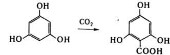 Осуществляют обычно при 90-130 °С и давлении 0,4-0,7 МПа; выход продукта 50-90% (присутствие Н2О сильно снижает выход). Природа щелочного металла обусловливает строение продукта р-ции. Феноляты Na и Li дают орто-гидроксикислоты, феноляты К - пара-изомеры. Аналогично протекает р-ция с конденсир. полициклич. и гетероциклич. фенолятами. Электроноакцепторные заместители в ароматич. ядре затрудняют Кольбе - Шмитта реацию, электронодонорные - облегчают. Так, флороглюцин, резорцин, пирокатехин легко карбоксилируются в водном р-ре в присут. К2СО3, напр.: