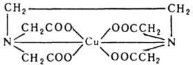 КОМПЛЕКСOНЫ, органические хелатообразующие соединения, содержащие в молекуле способные к координации атомы N, S и (или) Р, а также карбоксильные, фосфоновые, фосфонистые и др. группы. Комплексоны - кристаллич. в-ва, как правило, раств. в воде, не раств. в этаноле и большинстве др. орг. р-рителей; плавятся с разложением. В твердом виде и в р-ре нек-рые комплексоны представляют собой цвиттер-ионы. Комплексоны-полиосновные к-ты, диссоциирующие в интервале рН от 2 до 14. В водных р-рах с катионами (М) переходных d- и f-элементов, щел.-зем. и нек-рых щелочных металлов комплексоны (L) образуют устойчивые внутрикомплексные соед. - комплексонаты разл. состава: моноядерные кислые (протонированные) МНxL, средние (нормальные) ML и гидроксокомплексы М(ОН)xL; би- и полиядерные M2L и МnL; ди- и трикомплексонаты ML2, ML3. При наличии в системе неск. разл. катионов и лигандов возможно присутствие гетероядерных MxM'yL, разнолигандных MLxL'y и более сложных по составу комплексонатов (напр., МxМyLmL'n), в т.ч. полимерных. Высокая устойчивость комплексонатов объясняется тем, что при их образовании замыкаются два, три или более хелатных цикла (металлоцикла), как, напр., в случае комплекса Сu с динатриевой солью этилендиаминтетрауксусной к-ты: