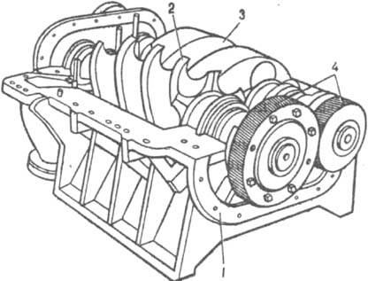 Рис. 4. Винтовой компрессор: 1 - корпус; 2, 3 - ведущий и ведомый винтовые роторы; 4 - шестерни.