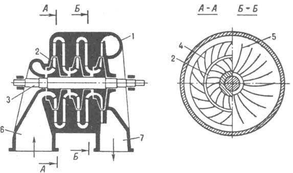 Рис. 5. Центробежный компрессор: 1 - корпус (улитка): 2 - рабочее колесо: 3 - вал; 4 - устройство для торможении потока газа и повышения давления (диффузор); 5 - направляющий аппарат; 6, 7 - всасывающий и нагнетательный патрубки.