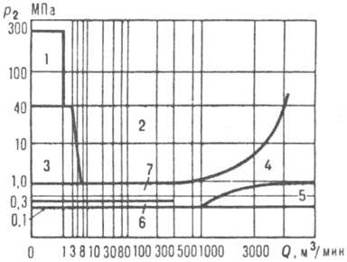 Рис. 7. Области применения компрессоров: 1-3 -поршневых (соотв. вертикальных, оппозитных и угловых W-образных); 4 - центробежных; 5 - осевых; 6, 7 - роторных (соотв. жидкостнокольцевых и пластинчатых).