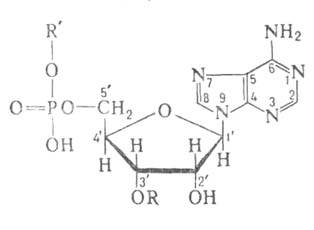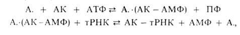 где аминоацил-тРНК-синтетаза - фермент, АК - активируемая аминокислота, АТФ - аденозинтрифосфат, ПФ - пирофосфат, АМФ - аденозинмонофосфат. Карбоксильная группа аминокислоты в АК-АМФ связана ангидридной связью с остатком фосфорной к-ты (см. ф-лу; R'-ацил аминокислоты, R = Н), а в АК - тРНК - сложноэфирной связью с гидроксильной группой в положении 2' или 3' рибозы концевого остатка аденозина тРНК (в ф-ле R'-продолжение цепи тРНК, R-аминоацил):