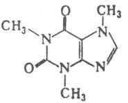 КОФЕИН (1,3,7-триметилпурин-2,6-дион), мол. м. 194,2; бесцв. горькие кристаллы без запаха; т. пл. 235 °С, легко раств. в горячей воде (1:2), СНСl3, трудно - в холодной воде (1:60), этаноле (1:50), диэтиловом эфире (1:1300). Кофеин-пуриновый алкалоид, выделенный из кофе (Cofea arabica L.) семейства мареновых (Rubiaceae). Кроме того, он находится в чае (Theae sincnsis) семейства