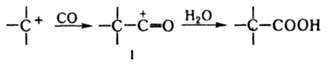 Карбениевые ионы образуются в условиях р-ции из олефинов, спиртов, алкилгалогенидов, эфиров, а также углеводородов, содержащих Н у третичного атома углерода. Р-ция протекает через образование промежут. оксокарбениевого иона (ф-ла I). В случае олефинов Коха - Хаафа реакцию проводят обычно при 0-40°С, постепенно добавляя олефин к смеси НСООН и конц. H2SO4; реакц. смесь выливают на лед и отделяют к-ту. Выходы к-т определяются устойчивостью карбениевого иона и достигают 95%, напр.: