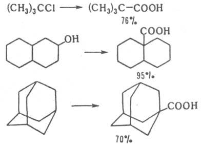 Искусственные приемы, позволяющие увеличить концентрацию СО (малая скорость перемешивания, добавление ССl4), приводят к образованию к-т с вторичными радикалами. Коха - Хаафа реакция имеет препаративное значение и особенно широко используется в ряду адамантана. Р-ция предложена Г. Кохом и В. Хаафом для олефинов в 1958.