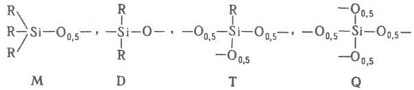(М, D, Т и Q-соотв. моно-, ди-, три- и тетрафункциональные звенья; индекс 0,5 у атома О показывает, что этот атом является общим для данного и соседнего атомов Si). Кремнийорганические полимеры, макромолекулы к-рых состоят в осн. из звеньев М и D, являются кремнийорг. жидкостями; строение их можно представить след. образом: