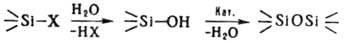(Х-хлор, алкокси- или ацилоксигруппы) Из монофункцион. соед. R3SiX образуются гексаоргано-дисилоксаны, из дифункцион. мономеров R2SiX2 - линейные полимеры или циклим. олигомеры. Вероятность образования тех или иных продуктов зависит от природы и кол-ва групп R и X в исходном мономере, полярности, величины рН и фазового состояния реакц. системы. При гидролитич. поликондснсации трифункцион. мономеров RSiX3 чаще образуются трехмерные полиорганосилоксаны; в пром-сти синтез проводят только до образования термореактивных олигомеров, переходящих в трехмерное состояние (см. Сетчатые полимеры) при послед. переработке в изделия. В особых условиях (специфичных для каждого трифункцион. мономера) можно получить олигомеры циклолинейной структуры. При использовании мономеров с объемными группами R (напр., фенильная, изобутильная) необходимо проводить процесс при строго определенном соотношении силан:вода (1:1,5) в смешивающемся с водой полярном орг. р-рителе и большом разбавлении. При пром. получении полиметилсилсесквиоксана процесс осуществляют гетерофазным методом при большом избытке воды в условиях рецикла реакц. смеси. Более сложен состав продуктов гидролитич. поликонденсации тетрафункцион. мономеров, напр. (C2H5O)4Si. 2) Каталитич. полимеризация циклоорганосилоксанов [в осн. 3- или 4-членных; кат.-чаще КОН, NaOH, R4NOH (R=СН3, С4Н9, С6Н5СН2 или др.), силаноляты щелочных металлов, эфират BF3, H2SO4, нек-рые к-ты Льюиса и сульфокислоты] - основной метод синтеза линейных высокомол. полиорганосилоксанов: