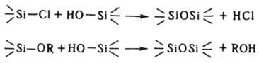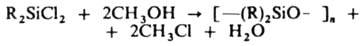 Эти р-ции происходят также при гидролитич. поликонденсации органохлор- и органоалкоксисиланов и могут значительно влиять на строение конечных олиго- и полисилоксанов. Вторая р-ция протекает при вулканизации кремнийорг. каучуков с концевыми ОН-группами под действием алкоксисиланов. Один из перспективных методов синтеза полиорганосилоксанов - метанолиз органохлорсиланов, напр.: