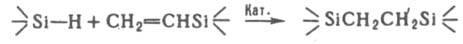 (кат. - соед. Pt и Rh, чаще H2PtCl6.6H2O). Реагирующие группы могут находиться в одном соед. (мономере или олигомере) или в разных. Напр., гидросилилирование n-диметилсилилвинилбензола приводит к образованию полидиметилсилил-n-фениленэтилена:
