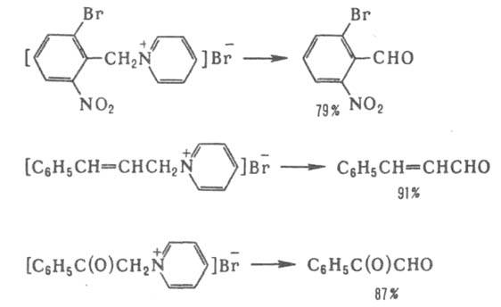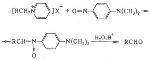 Четвертичную соль обрабатывают нитрозосоединением в водно-пиридиновом р-ре в присут. стехиометрич. кол-ва NaOH или др. основания. Нитрон, к-рый обычно выпадает в осадок, гидролизуют разб. НСl или H2SO4. Альдегид экстрагируют эфиром. Метод применяют для получения ароматич., гетероциклич., a, b-ненасыщенных альдегидов, а также a-кетоальдегидов, напр.: